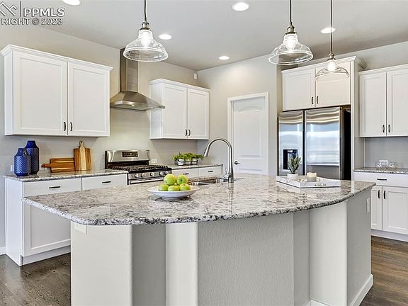 Life at The Farm includes mountain views of the Front Range including Pikes Peak, District 20 schools, access to The Gathering Place clubhouse & gym, pool and lake, extensive walking paths, and fiber for high speed internet. In the summer, the small lake allows paddle boarding and shoreline fishing! You are minutes from the United States Air Force Academy and Interstate 25, plenty of shopping, coffee shops, restaurants and entertainment. This beautiful home fits right in at The Farm, with an upscale farmhouse feel. Less than 3 years old, this fresh, modern, clean home brings in tons of natural light and mountain views into the main floor great room. Oak hardwood floors on the main level and an electric fireplace in the living room. The kitchen features white cabinets, a large granite countertop island, SS appliances and a walk in pantry. The front bedroom would make a beautiful quiet office, slightly tucked away from the rest of the home. Main floor primary bedroom has a 4-piece bath, oversized standing shower, and spacious walk in closet. The mud room connects to the main entry or the main floor laundry and primary closet. The basement has an additional 3 bedrooms and 2 bathrooms, where one of the bedrooms has an adjoining bathroom and walk in closet. Water heater, furnace, and roof are all less than 3 years old. Property is already landscaped, backyard fenced, and includes a storage shed. Consider these features if you're thinking about a nearby new build! This home is on one of the larger lots for The Farm, at 9700 SF, you will enjoy a decent sized back yard.