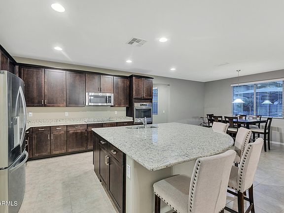 Spectacular, lightly lived in home in the sought after community of Eastmark! Pride of ownership is eminent in this home. Beautiful paver driveway and walkway up to the front porch which is a perfect spot to sit and enjoy your morning coffee. Gorgeous 18'' tile throughout the first floor and custom interior paint throughout the entire home along with window covering and ceiling fans in every room. Your new home includes maple espresso cabinetry throughout with a full overlay, soft close doors and elegant cabinet hardware. The kitchen has a huge kitchen island with granite countertops and upgraded stainless steel appliances including a 5 burner cooktop, built in wall oven, microwave, Bosch dishwasher and an LG refrigerator. Your gourmet kitchen also includes a fabulous walk in pantry. Just around the corner from your kitchen you have a fabulous work space for a home office and additional cabinetry for storage. The downstairs also includes one full bedroom and bathroom perfect for your guest. As you continue to the upstairs you will notice newly installed vinyl floors at the stairs as well as the loft and hallways. The loft includes plantation shutters and a complete wall enclosure that could make this space another bedroom. The spacious owner's suite has his and her vanities as well as a make up sitting area, separate tub and shower, linen storage and walk in closet. All guest bedrooms also include walk in closets. Another bedroom is an ensuite perfect for guest and the other two bedrooms have a Jack and Jill bathroom which is absolutely perfect for the kids. Your backyard oasis has a nice covered patio with a paver extended patio including your very own built in gas BBQ and fire pit! Need to practice your putting skills? You will absolutely love having your very own putting green and you have plenty of space if you want to design your very own pool in the backyard. For a complete list of upgrades and a floor plan of this spectacular home go to the document tab. Welcome HOME!