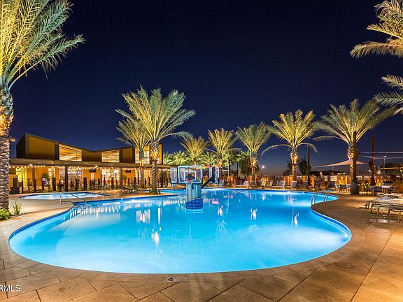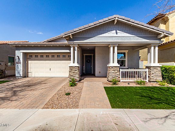 This stunning single-story home in Eastmark features two primary suites, a third bedroom, and a hall bath, perfect for multi-generational living. The oversized front porch and remodeled front yard with new turf enhance curb appeal. Situated on a north/south-facing lot, it offers 10-ft ceilings, no carpet (tile & LVP flooring), upgraded lighting, and a great room with a built-in bookcase and triple window slider. The gourmet kitchen includes white cabinetry, granite counters, an oversized island, gas range, and walk-in pantry. The primary bath boasts a super shower, while the custom backyard offers extended pavers, a firepit, real grass, and a paver pad for trash cans. Upgrades include a water softener and epoxy garage flooring.