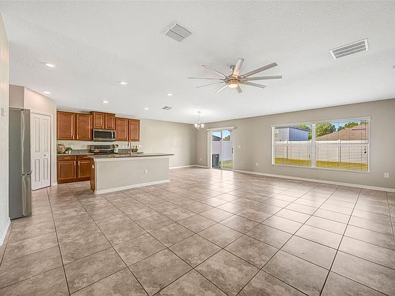 A great value! Come see this lovely 4 Bedroom 2 Bath home in the desireable Highland Estates community. The wide open floor plan creates the perfect environment for everyday living or entertaining! The kitchen boasts stainless appliances, wood cabinets, walk in pantry, large island with breakfast bar and a separate dining area! The large open family room is great for watching movies together or enjoying a fun game night. Ceramic tile floors surround the foyer, kitchen, dining and living spaces along with all baths and laundry room. Upgraded ceiling fans in all rooms with newer lighting fixtures throughout. The spacious primary suite is situated away from the other three bedrooms allowing for privacy and features newer laminate flooring. The large en suite primary bath features dual sinks, a walk in shower, and huge closet! Separate laundry room with washer and dryer included. Fully fenced backyard with enough space to add a pool or large patio. Community offers clubhouse, pool, basketball court, fitness center, and miles of winding sidewalks - perfect for cruising the neighborhood! Call today to schedule your private showing!
