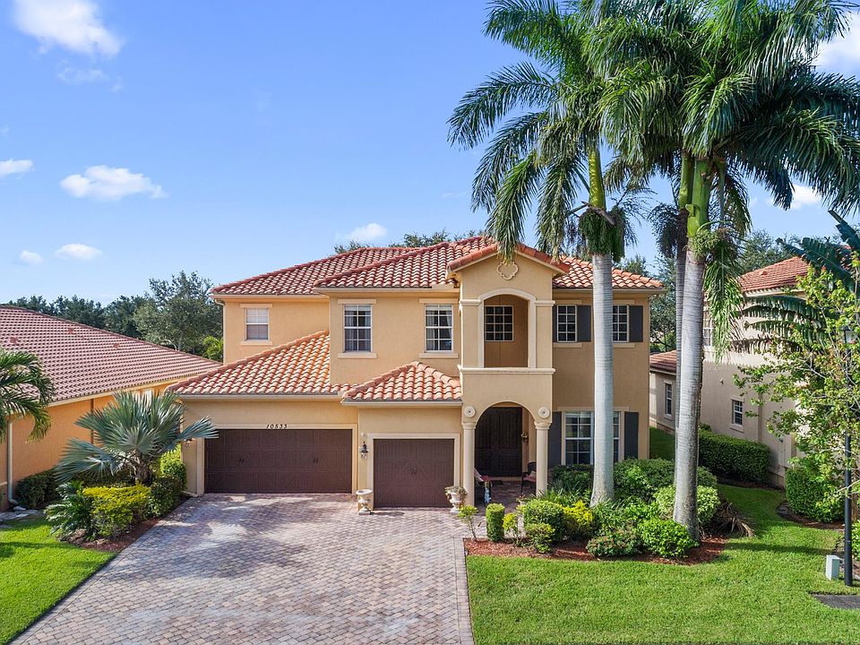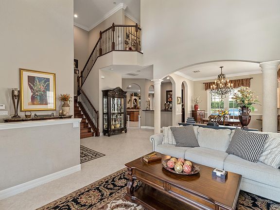 Welcome home to this spacious open floor plan Diamond model featuring 6 bedrooms and 5 1/2 baths. Gourmet kitchen with stainless steel appliances, double ovens, walk in pantry and center island with prep sink and wine cooler. French doors open to the screened in travertine patio perfect for outdoor entertaining overlooking the custom pool with spa and cascade waterfall. Master bedroom suite features a large master bath, his and hers closets, and sitting area perfect for home office or workout area. Home features accordion shutters on first floor, impact windows on second floor, first floor guest suite, and oversized 3 car garage with storage all within a desirable gated community close to everything.