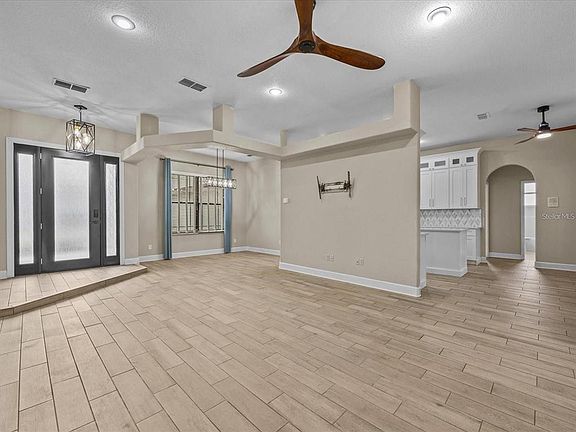 Under contract-accepting backup offers. Welcome to this beautifully updated two-story home in Clermont, FL! Set on a spacious corner lot, this 4-bedroom, 2-bath home showcases fresh interior paint, new porcelain-style tile flooring, and an impressive 8-foot glass-panel front door. Inside, you’ll find an office space off the living room and a stunning new kitchen with custom cabinetry, quartz countertops, farmhouse sink, tile backsplash, gold fixtures, LED lighting, USB outlet, and all-new stainless appliances. The living room is filled with natural light and features new blinds, curtains, and ceiling fan. The primary suite includes an upgraded walk-in closet, new fan, and spa-inspired bath with custom tile, dual shower, and soaking tub, while the secondary bath offers a new vanity, fixtures, and tub/shower combo. Upstairs, the fourth bedroom features new carpet, perfect for guests or office use. Additional upgrades include new roof, all new front Anderson windows under warranty, and solar café lights in the lanai. Outdoors, enjoy a screened retreat with pool and waterfall, new solar panel system, updated pump, and professional landscaping with palms, fountain, and lighting. For boaters, the home offers a ribbon-paver side driveway for boat or camper parking and community lake access with boat ramp, dock, and gazebo on the Clermont Chain of Lakes.