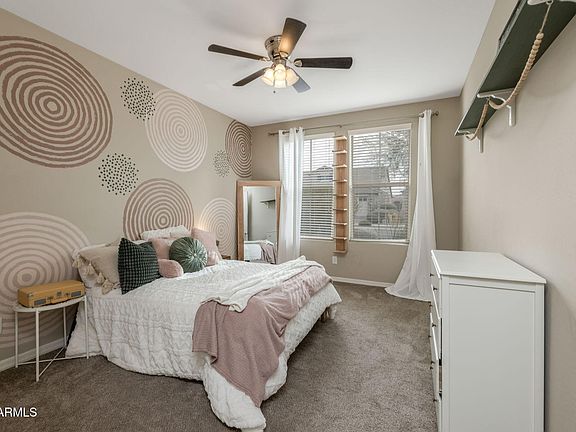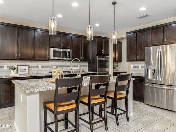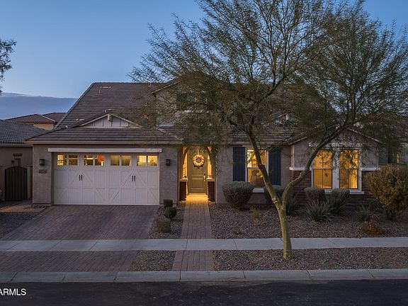This stunning home in the highly sought-after Eastmark community offers incredible curb appeal with pavers and brick accents. Step inside to find neutral paint and upgraded coffered ceilings that add a touch of elegance. The dining room features an artistically designed accent wall, while the kitchen impresses with granite countertops, dark wood cabinets, a subway-tiled backsplash, stainless steel appliances, a double oven, modern pendant lighting, and a pull-out recycling center. Additional cabinet and countertop space across from the walk-in pantry adds extra convenience. The spacious primary suite is filled with natural light and showcases a shiplap accent wall. A charming barn door leads to the luxurious bathroom, which features dual vanities with ample storage, a massive tiled shower with a rainfall showerhead, and separate spaces for added comfort. Conveniently located on the first floor, this suite offers the ultimate retreat. With three additional bedrooms downstairs and two upstairs, there's room for everyone. The upstairs loft is expansive and includes a gorgeous feature wall that adds character and style. The backyard is a dream come true, complete with an extended pergola, a sparkling pool with upgraded water features and a Baja step, and a spa for ultimate relaxation. The paver pad area includes a gas fire pit and a built-in grill, perfect for entertaining year-round. Living in Eastmark means access to resort-style amenities, including luxurious pools, splash pads, abundant parks, Steadfast Farm, and the state-of-the-art clubhouse, "The Mark," which hosts year-round events and activities. Don't miss your chance to own this extraordinary home andlive in the luxury you deserve!