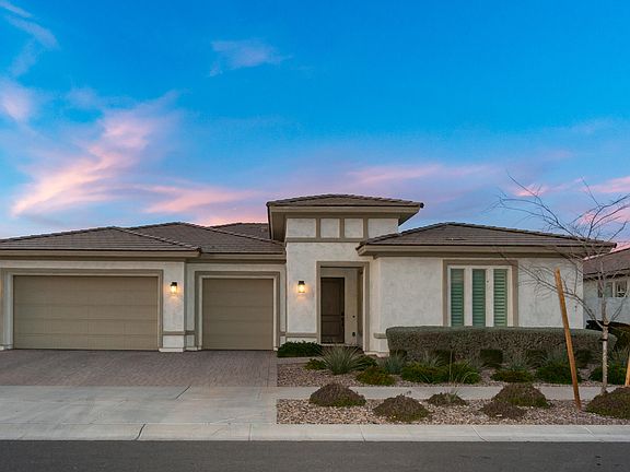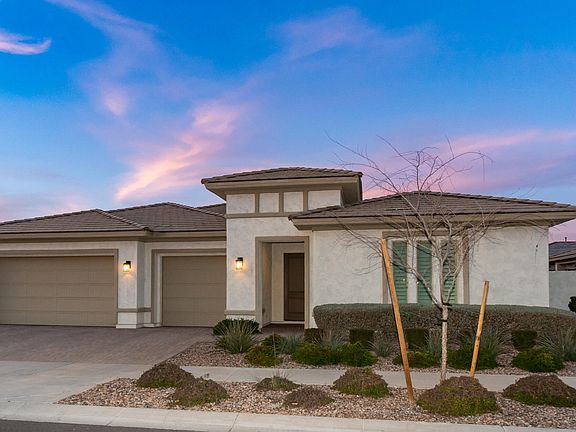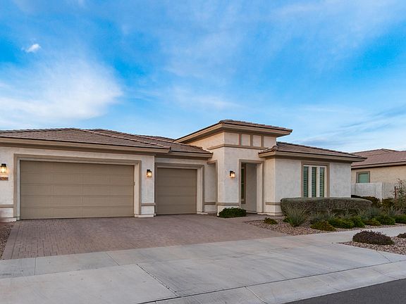 Gorgeous Move-In Ready Home in the gated Estates at Eastmark community! Beautiful curb appeal and a three car garage greet you upon driving up, and inside you'll love this functional split floor plan with soaring ceilings, beautiful flooring, and tons of windows with wood shutters for natural light. The gourmet kitchen is a chef and entertainer's delight, with massive island and breakfast bar, stainless steel appliances and farmhouse sink, upgraded cabinetry, gas cooktop, tons of storage, walk-in pantry, and is open to the dining space and spacious family room. There's spacious loft/den which could be converted to an additional bedroom. The secondary bedrooms are spacious with en-suite bathrooms and spacious closets. The Primary Bedroom is huge, fitting even the largest of furniture and opens to the spa style Primary Bathroom, with double sinks, modern soaking tub and sleek walk-in shower and oversized walk-in closet. Experience indoor/outdoor living with the impressive wall of glass sliding glass door, which opens to the beautiful covered patio with stone flooring, a gorgeous gazebo with outdoor gas fireplace, synthetic grass, and space for a pool down the road. If you're looking for community, then the Estates at Eastmark are perfect for you, as they have a private recreation center featuring sparkling pool, parks, and fitness center. The community is active with all sorts of events, parties, and even concerts! Welcome home!