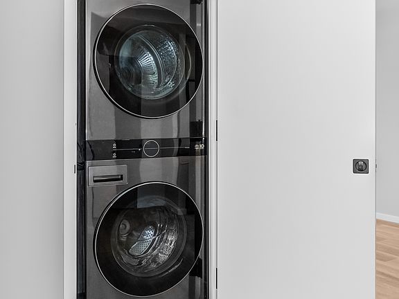Sleek custom cabinetryWarm white oak floorsBlackout shadesFull size window shadesSeamless backsplashesFull-size lg washer-dryersHigh-performance appliance package