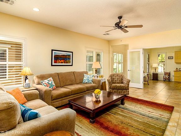 A very well-appointed Aster Model is now available! Do not miss out on this very popular two bedroom and den floor plan with a fantastic chef's kitchen that includes a built-in island with extra storage. This home also offers an elevated home site & the patio has been extended with pavers and a pergola covering and side panels offering privacy and views of the Eastern Mountains. Beautiful laminate and tile flooring throughout and this plan offers large windows all across the back of the home providing views from the kitchen, dining area, and master bedroom. Additional upgrades include Hunter Douglas Shutters and premium ceiling fans. The office/den offers a built in desk and the master closet includes custom shelving. All Appliances stay including the living room and kitchen TV. Patio furniture can stay with a full price offer. SID has been PAID IN FULL. This home is a beauty and a must see!