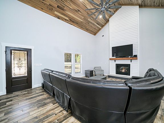 #RanchFarmhouseStyle If you want a large lot with a country feel then look no further! This beauty sits on over 2 acres of land. After a long day at work come relax on the rocking chair front porch (8x55) and sip on some sweet tea. Once you head inside you will be greeted by wood look ceramic tile flooring and vaulted ceilings. The great room also features a propane double fireplace with a shiplap surround, and wood mantle. Enjoy cooking those family meals in the kitchen that has a large island (5x8), stainless black appliances, subway back splash, and tons of custom cabinet space. The dining room is perfect for those family gatherings. The master suite is just perfect. It has the double sided fireplace, vaulted ceilings, and recess lighting. The master bath has granite counter tops and a custom tiled walk in shower. Before you leave check out the rear covered patio. Just relax and enjoy the nature. There is also an additional concrete pour that is great for grilling out.