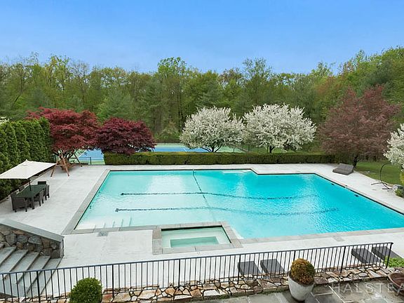 Exceptional & well appointed estate w/gated entry & sweeping park-like grounds offers a premier location & a private oasis w/ expansive entertaining terraces overlooking grand pool,spa, tennis court & a car collectors dream w/ garage capacity for 8 cars. Stunning new gourmet kit w/breakfast rm, FR & french doors opening to expansive terrace featuring spectacular views. Dramatic grand scale entertaining rm w/23ft beamed cathedral ceiling, FPL & sun-filled walls of windows provide the perfect venue for special gatherings. Formal areas incl LR, DR, handsome library & MBR suite all w/FPL. 4 add'l BDRMS & bonus playrm complete the 2nd flr. Add'l private sun-filled guest wing w/FPL sitting rm, steps from private theater. LL features full size apt w/kit, covered porch, gym & wine cellar.