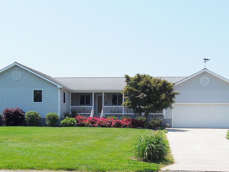 This single family custom-built 3 Bedrooms, 2 Bath single floor residence with basement has an attached oversized 2-car garage with electric door opener and is located on a one acre lot. Master bedroom has large walk-in closet and private bath. Laundry room is located on first floor. Great room has natural gas fireplace with sliding patio doors that lead onto rear deck area. Kitchen has weathered oak cabinets with color coordinated tile countertops. Kitchen opens into dining area that has sliding patio doors that also lead onto rear deck area. Landscaping is maintained by a lawn irrigation system that also has a drip system in flower beds. House has a security system, underground utilities (telephone, cable, electric), natural gas forced air heat & central air conditioning, private septic system and a well with oversized 1.0 hp pump for lawn sprinklers. House also has a covered front porch with vinyl railings, recessed lighting and a concrete floor. There are also concreted walkways, driveway and rear patio area. The house has maintenance free vinyl siding, railing, decking & fencing as well as a private fenced backyard. Professional landscaping. Property is not in a flood zone. Asking price is not firm - offers are welcomed.