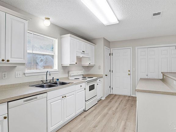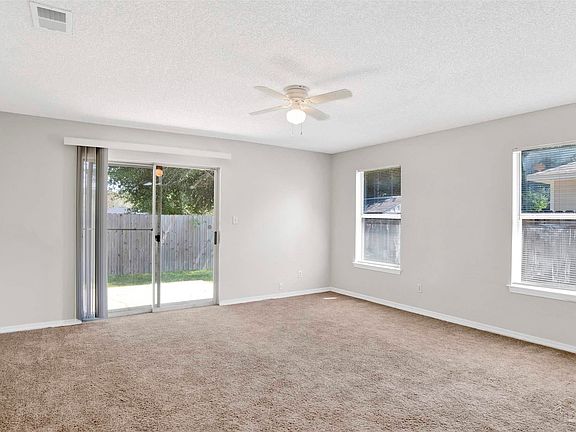 Move-in ready and full of charm, this 3-bedroom, 2-bath home has great curb appeal with fresh sod and a welcoming exterior. Step inside to a bright and inviting living room featuring plush carpet and sliding doors that open to the backyard. The kitchen and dining area boast brand-new luxury vinyl plank flooring, a center island, breakfast bar, pantry, and crisp white cabinets with matching appliances—perfect for both everyday living and entertaining. The split-bedroom floor plan offers privacy for the spacious primary suite, complete with carpet, ceiling fan, and a large walk-in closet. The en-suite bath features tile flooring, double vanities, a garden tub, and ample space to unwind. The additional bedrooms are generously sized with ceiling fans and plenty of closet storage, while the second full bath includes tile flooring, a single vanity, and a tub/shower combo. A conveniently located laundry closet and single-car garage are just off the kitchen. Outside, the privacy-fenced backyard with an open patio is ideal for BBQs, entertaining, or simply relaxing.
