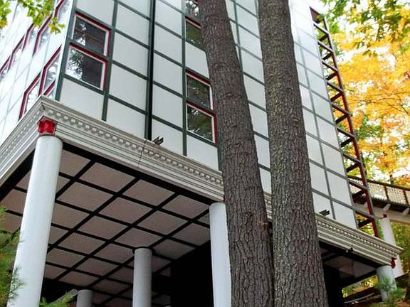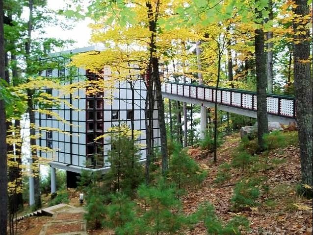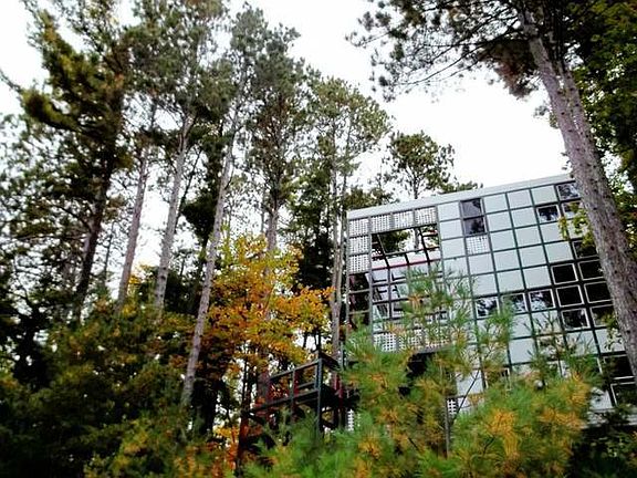 The Jahn House is truly a one of a kind work of art. It is the only residential property ever created by renowned architect Helmut Jahn who has been recognized by the American Institute of Architects as one of the "Ten Most Influential Living American Architects". Situated on stunning Catfish Lake in Eagle River Wisconsin, this home is nestled upon the shoreline of the largest freshwater chain of lakes in the world. This 30' x 30' cube, gridded in three-foot modules and perched on stilts, is meant to distinguish itself from its natural setting and become an ideal object in the landscape. Designed for a wooded slope with lake views, it was a vacation home with the understanding that it would later become a year-round residence. The cube form is reiterated in a grid that is maintained throughout the interior through the use of lattice and open areas and a complex mesh of solid and open panels.
