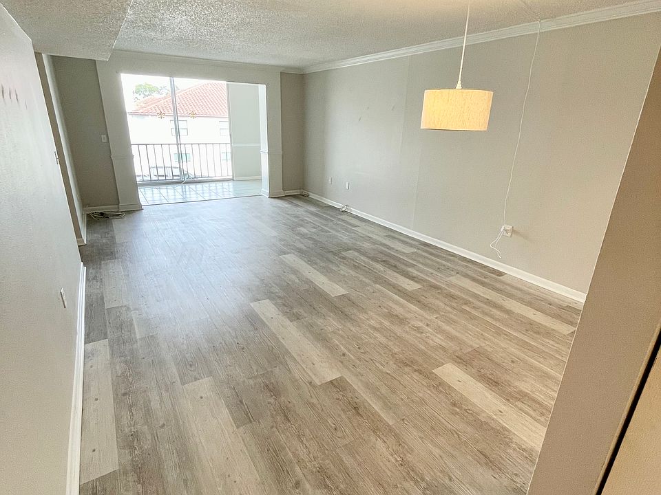 CLEAN second floor, one bedroom/one bath unit in highly desirable lakefront condo community, Villa Milan. At 720 sq ft, this light and bright unit is spotless and boasts central A/C, an open floor plan with a large bedroom (room for a king size bed), spacious bedroom closet and large pantry/coat closet, modern tile floors, large windows, updated bathroom, a screened-in Florida room with slider doors, crown moldings, granite countertops, and a gourmet GE Profile 5 burner stove with double oven. Elevator, large laundry facility and the pool are all just a few steps away. Unit also includes a separate bonus storage unit. Rent includes parking space, trash, water, sewer, pest control, and Spectrum cable TV (internet not included). Solid concrete block construction provides a quiet space with low electric bills.