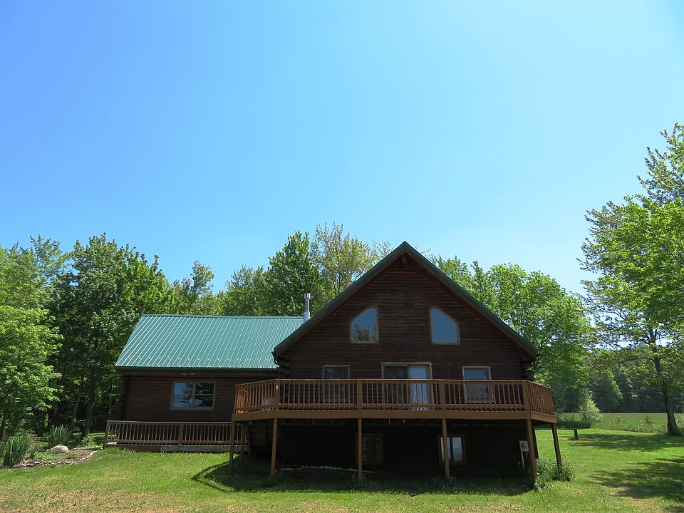 PRICE REDUCTION!!! Spacious 4 Bedroom 1 Bath log home on 26 acre, mostly wooded lot. French doors open to a expansive deck, to enjoy PANORAMIC VIEWS especially at sunset! This home offers an open floor plan, lots of natural light to come in with a wall full of chalet style windows, cathedral timber frame ceilings, large entry area for removing shoes. Full finished basement family room, office, craft room, unlimited possibilities. Newer steel roof, Efficient hot water baseboard multi zone heat, 2 car attached garage, out buildings for added storage.