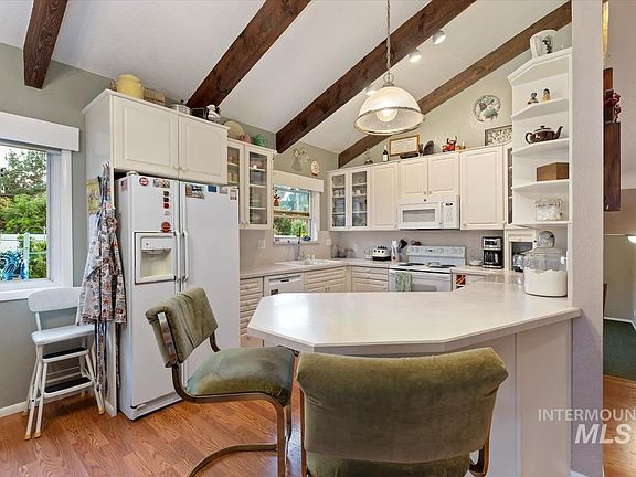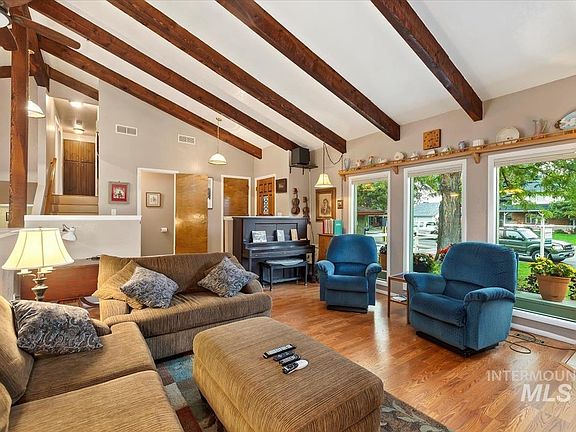 Huge opportunity to own property in West Boise off Five Mile and Ustick Road near countless local amenities including walkability to Jullion Park and Albertsons. This home has been updated with fresh exterior paint, newer furnace and AC (4 years), newer roof (2019), driveway, newer appliances, new siding on south side of home, low-E windows on west side of home, fresh paint in garage interior, a pull-down ladder, epoxy flooring and even a master bath remodel! The interior features a large front room great for gatherings with beautifully exposed beams, central vac unit, lower bonus room that a fireplace and even additional backyard access. Enjoy your beautiful, perennial-filled backyard oasis that is wonderful for entertaining and highlights an above ground pool, auto sprinkler irrigation, multiple decks, and playhouse/shed. Close to many essentials - groceries, pharmacy, bank and gas!