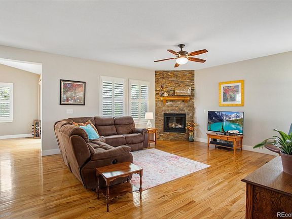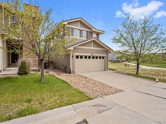 Introducing a stunning two-story move-in ready 3 bed, 3 bath home that boasts immaculate finishes and an open concept main level living space highlighted by beautiful hardwood floors. The spacious kitchen features a large island, cherry cabinetry, granite countertops throughout, subway tile backsplash, stainless steel appliances with gas range, and convenient pantry - perfect for preparing and enjoying meals with family and friends. Relax in the living room by the stack stoned gas fireplace adorned with a ceiling fan and wall of windows to maximize comfort. The dining room brings in natural light and offers access to a spacious back deck, ideal for entertaining and soaking in the serene outdoor surroundings. On the upper level, the primary ensuite boasts a walk-in closet and private bathroom with a dual sink vanity and large soaking tub/shower combo. Two additional bedrooms provide ample space for family, guests, or a home office. The expansive unfinished basement offers endless potential with high ceilings & rough-in plumbing for an additional bathroom. Enjoy low maintenance living in the backyard featuring a raised Trex deck sitting area with views of the beautiful green belt and trails. Relax & unwind with coffee in the morning or a drink in the evening in privacy courtesy of no neighbors to the east. This home also features window shutters throughout and a two-car garage. Neighborhood amenities include a community pool, park and trails. Downtown Parker shopping & dining includes Black Haus Tavern, Vines Wine Bar, Fika Coffee House, Natural Grocers, Crumbl Cookies, Sulpher Gulch Trail, Parker Recreation Center, Parker Symphony Orchestra and much more. Minutes from I-25, E-470, and the new Sky Ridge Light Rail Station. Showcasing genuine pride in home ownership, this home is a must-see with flawless finishes and a prime location. Don’t miss the opportunity to make it yours.