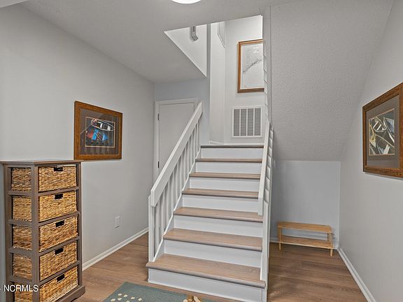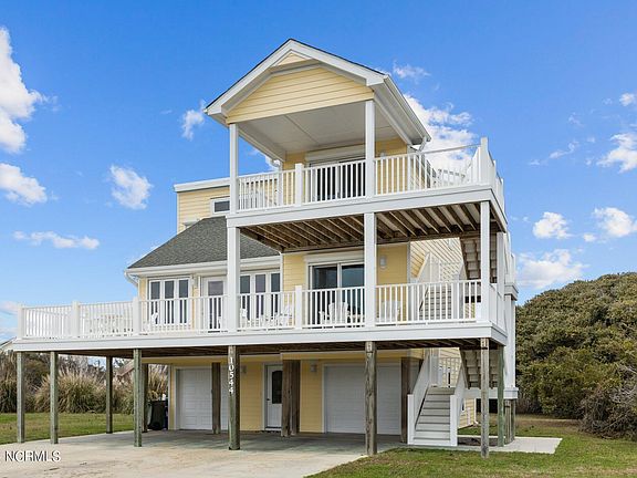 THE POINT @ EMERALD ISLE...LOCATION, LOCATION!!! Beautiful, open, fully furnished & move-in-ready 2nd row, single family home with updates throughout. Plenty of space inside & out for friends & family to enjoy! Beautiful ocean views, sunrises, & sunsets! Walkway to the ocean just 3 houses over. Large new (2019) white trex deck off the open living room with new (2023) luxury plank flooring & vaulted ceilings. This floor includes an ocean facing bedroom that opens to the deck. Another new (2019) white trex deck off the top level front bedroom boasts great ocean views. Deck furniture for all decks included! **Main level 2nd floor....Recently updated kitchen has gorgeous granite countertops & maple kitchen/pantry cabinets with pull outs. The kitchen includes a rear deck perfect for grilling. Look out from the kitchen bar to the dining area surrounded by large windows. 2 bedrooms (#1 king & #2 twins) & a full hall bathroom with granite countertops & travertine walk-in shower plus adjoining laundry closet. **Top level 3rd floor....Loft area for reading/TV watching or just relaxing. 2 bedrooms (#3 king & #4 queen) & a full hall bathroom with granite countertops & travertine shower. **Ground level....Includes two fully enclosed single car/boat/golf cart garages with ample storage shelving. Foyer has a storage closet & interior steps up to the main level. Hurricane shutters, all electric (with exception of only 2 with manual cranks). All new (2019) Hardie Plank siding installed & decks replaced in 2019. 50yr architectural shingles approx 15 yrs old (fireplace is not functional as chimney was capped). LVP flooring installed in living/dining, hallways, & stairs in 2023. Home has not been a rental but would have good potential. Come take a look to see all the nice features this home & location have to offer!