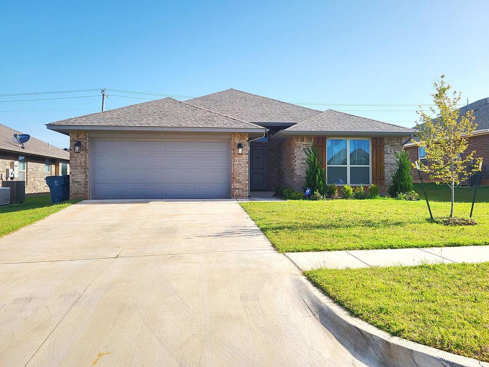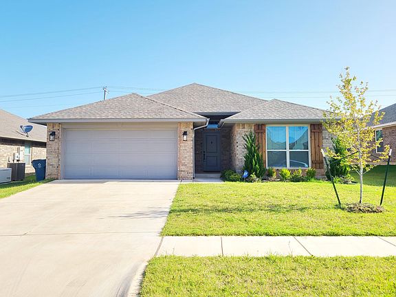 Wow! Come see this beautiful newer home located in Choctaw Schools! Home is only a year old and feels brand new. Features completely open living / dining and kitchen area. Living has soaring ceiling, fireplace and bright & airy. Kitchen has large island with granite countertops, stainless steel appliances, pantry and includes nice refrigerator. Primary suite features large vaulted ceilings, full bath with separate standing shower and large soaking tub as well as very large walk-in closet. Spare bedrooms are a great size as well the guest bath. Laundry room feeds into master closet for easy access. Storm shelter in two car garage. Fully fenced yard and covered patio. All this and just minutes from all the shopping and restaurants in Midwest City but located in Choctaw schools. Don't hesitate to reach out for the best of both worlds! Pets upon owner approval w/ min. $250 pet deposit. Tenant responsible for all utilities and all lawn maintenance.