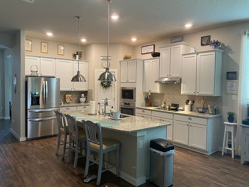 Beautiful, move-in ready one story located on private greenbelt lot. Open floor plan with tons of natural light. Wood tile throughout. Spacious kitchen with white cabinets, built-in stainless appliances, and large kitchen island with seating. Split master bedroom. Large master bath with double vanity, walk-in shower, and garden tub. Good size back yard with mature trees and a covered patio.