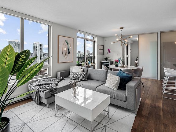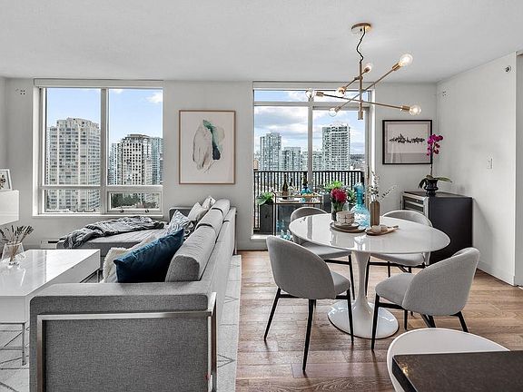 Enjoy sweeping city views by day and night! The SE outlook over historic Yaletown all the way to False Creek means this space has an abundance of natural light all day. With bright, open living spaces, this 2 bed + den + flex has room for both comfortable living and ample storage so no need to choose one or the other! With a den, and a flex room, one can be used as a pantry, w/in closet or a small WFH office. Meticulously updated by the current owner, features incl. gorgeous walnut hardwood flooring, quartz countertops & designer lighting & fixtures. Bldg amenities incl exercise, sauna/steam, and party rooms, courtyard, guest suite. Close to some of the city's best restaurants, cafes, shops, the Stanley Park Seawall and recreation, 1 parking, 1 locker & 2 bike storage!