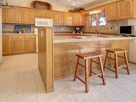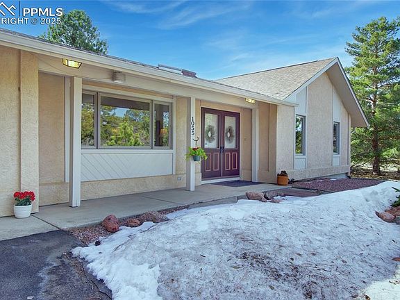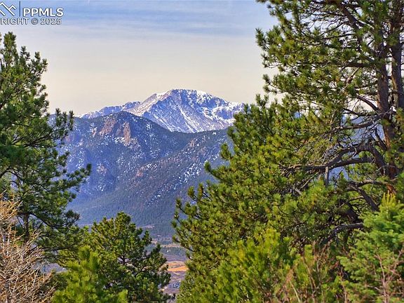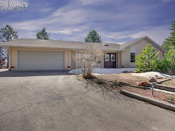 Beautiful updated ranch style home possible handicap access, garage, entry and decks are all flush with main level, no steps!! Very open and light from the moment you walk through the front door, every window lets the nature in of mature trees. Great room concept, great for entertaining large groups! Kitchen features a breakfast bar, many pull out shelves, a pantry and newer appliances. A double sided, gas fireplace makes the dining room and living room cozy on the cool nights! Many recent upgrades include real wood floors throughout, (no Carpet), the electric panel, water heater, primary bath, secondary bath, roof and gutters with gutter guard and the extensive trex decking. The primary bedroom features a walk in closet, an additional closet, private bathroom and a wonderful 8'x20' deck facing west to enjoy your morning coffee and sunsets. The lot next door, to the west, is owned by 3 neighbors, so the feeling is very private and quiet. The main level laundry features storage cabinets, a laundry sink and washer and dryer are included. Enjoy the trees and views when you entertain on the extensive 36'x16' deck and a 21'x9' patio. This home also features air conditioning, 5 ceiling fans, and a large useable carpeted crawl space with lighting for great storage. The garage includes overhang storage, a work bench and cabinets to get organized! Enjoy the natural landscaping on the 1/2 acre + lot with mountain and pikes peak views and many trees. There is also additional parking on the paved driveway to the side of the home. This truly is one level living at its best!!