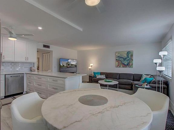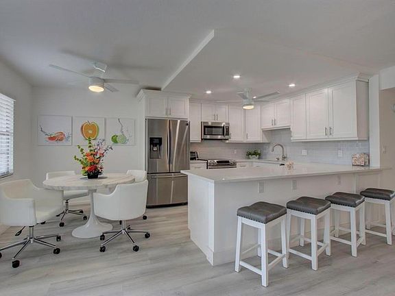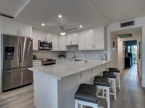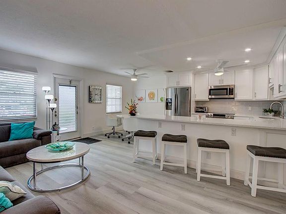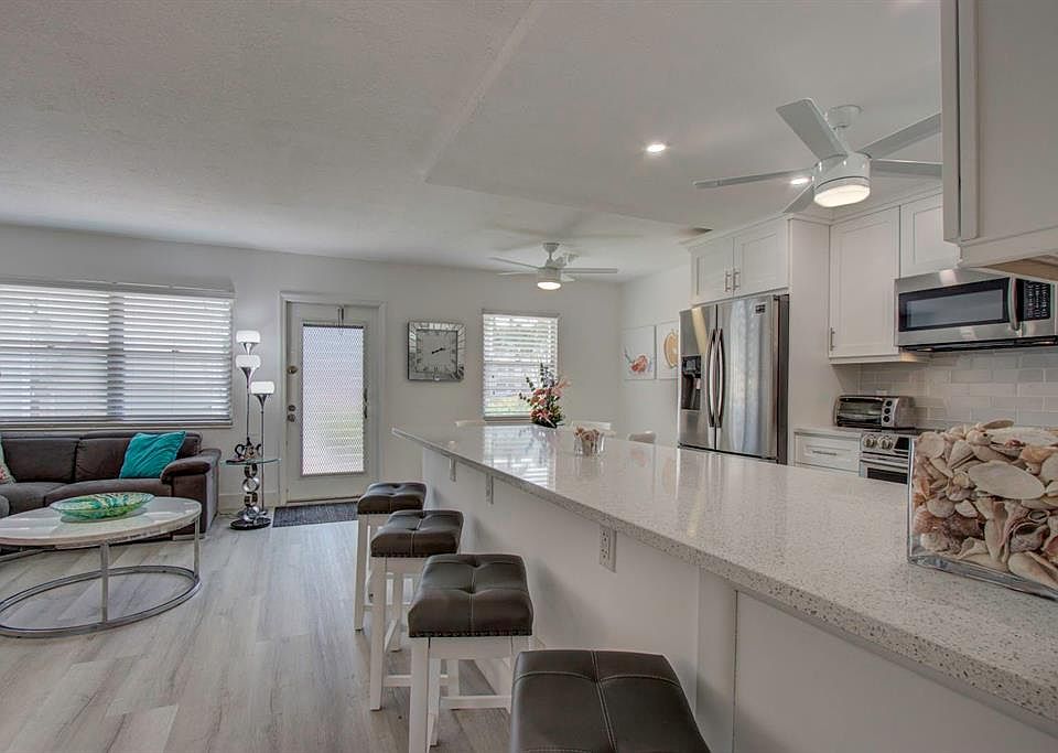MOTIVATED SELLER! GORGEOUS! Desireable first floor 2/2 unit with open Dining room, Living room, and Kitchen with Quartz countertops. MUST BE SEEN! Three fold sliding glass doors from both bedrooms into a completely finished Lanai with Hurricane Impact, full length, sliding glass doors. BRAND NEW A/C (2024), completely renovated and updated. . New Lux vinyl floors throughout. Parking spot is right infront. There is a heated Rexford pool, as well as heated indoor/outdoor pools at the clubhouse. Buses stop in front of condo and take you to the clubhouse and beyond. Close to houses of Worship. Pickle ball, tennis, water aerobics, huge fitness center, classes and activities are offered. Come see this spectacular home.