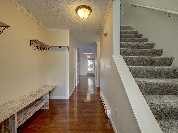 The townhome features a long driveway leading to a spacious attached 2-car garage. Inside, you'll find a cozy living room complete with a gas fireplace and sliding doors that open onto a lovely back patio, where you can unwind and enjoy your evenings in privacy.