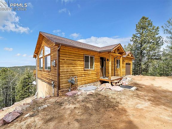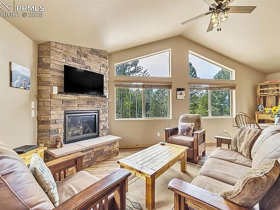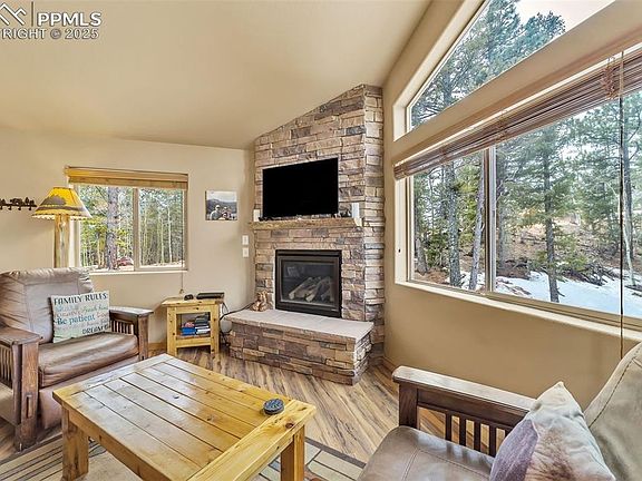 Welcome to this charming ranch-style home nestled in a beautiful mountain setting with breathtaking views. This 3-bedroom, 2-bathroom home offers great potential for either an income-generating property or a serene personal getaway retreat. Surrounded by aspen trees, the home features an attached 1-car garage and an abundance of windows that allow for plenty of natural light to fill the space. Vaulted ceilings and natural wood floors enhance the open, airy feel of the home, while a stunning stone fireplace serves as a focal point in the living area. The spacious kitchen is complete with sleek granite countertops, perfect for both daily meals and entertaining. The main level includes the primary bedroom, offering convenient one-level living with easy access to all the home's amenities. The walk-out basement provides additional living space with a cozy family room, ideal for relaxing or hosting guests. Enjoy being close to the Crags, Cripple Creek and all your hiking needs at Mueller State Park. With its scenic location, great potential, and inviting atmosphere, this property is a perfect escape to the mountains. Don’t miss the opportunity to make this peaceful retreat your own!