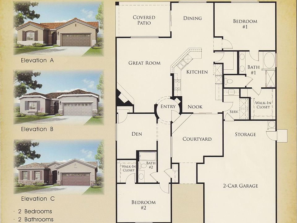Location-Location-Location! Resort style living, on the golf course with stunning mountain views & within walking distance to the Clubhouse! Del Webb 55+ community - very desired Magnolia model. 2 bedroom + office/den w/cabinets & closet. *private courtyard entrance * impressive 10ft ceilings * new high end flooring (luxury vinyl planks-wood look & carpet) & fresh paint * Lots of windows * double ovens * Refrigerator * slider drawers in kitchen * huge walk-in pantry * corian counters in kitchen * master suite * garden tub * separate shower * large walk-in closet * guest bedroom has walk-in closet and is on opposite side of house * indoor laundry with sink & storage cabinets * washer & dryer * corian window sills * Ceiling fans thru-out * covered patio & extended patio cover * Fountain * oversized 2 car garage with walk out door big enough to park 2 cars + golf cart. Newly painted exterior doors and shutters. Stuccoed eaves - nothing to paint! This home was only occupied for 5 years and is very well maintained. This Magnolia model is upgraded elevation C. Two clubhouses, indoor & outdoor pools & spas, tennis courts, pickle ball +++. Move in ready. Must see to appreciate. Close to shopping, restaurants, medical, movie theatres +++