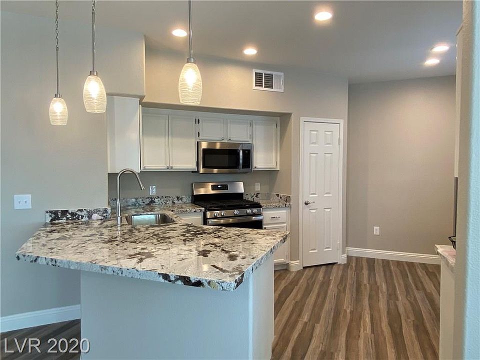 1st Floor Corner Unit with partial views of the city and strip. Beautifully renovated 2 bedroom, 2 full baths, 2 car garage (tandem) this unit has new kitchen & bathroom granite counters, all new appliances, new sinks, new fixtures, new fans and lighting, new flooring, new carpet, new window coverings, freshly painted throughout.
