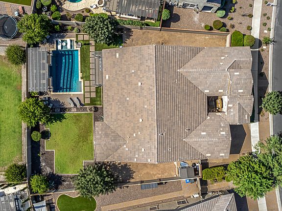 The outdoor space is a true sanctuary with a Pebble Tec pool, Travertine waterfall, lagoon-style entrance, and a privacy wall. Enjoy manicured turf, pavered walkways, and a grassy area for play.