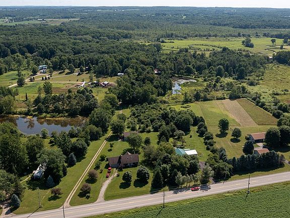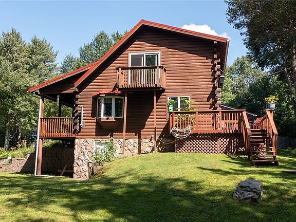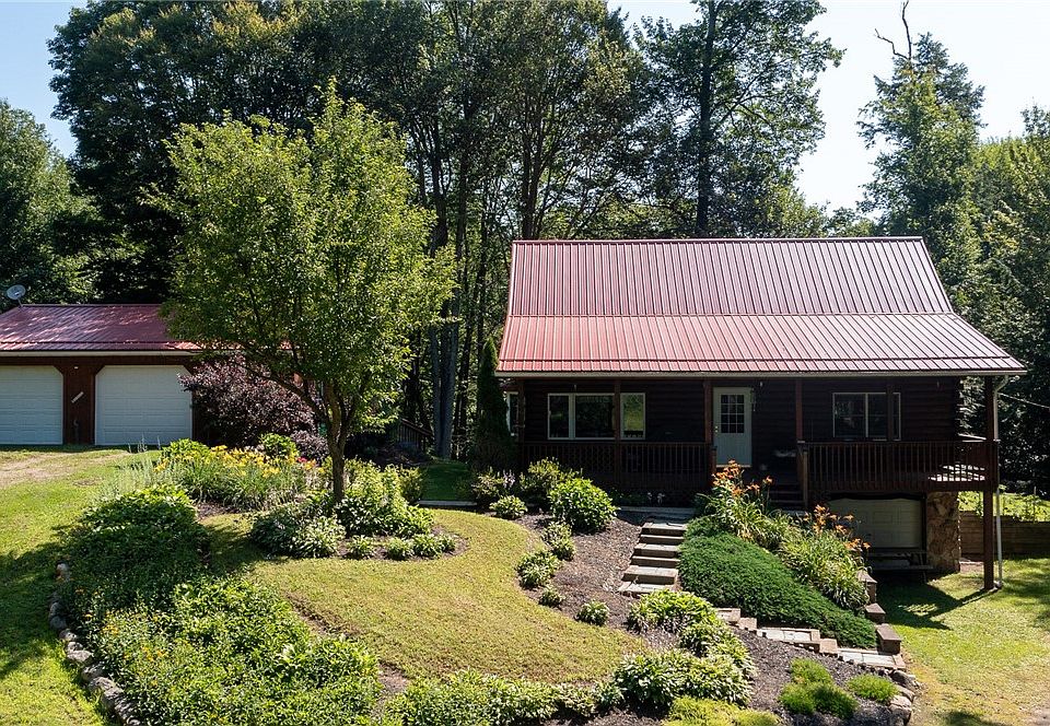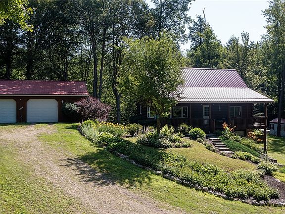 1994 Log Home on 15.5 acres with updated roof in 2017! Home features include a spacious Master suite with balcony, loft sitting area, open kitchen dining area, pellet stove, 2 full bathrooms, outlet basement with integral garage, 50 gallon hot-water tank. The exterior of the home is a slice of paradise featuring a covered front porch, back deck off the kitchen, large pond, creek and wooded lot for endless views. Bonuses include a 30x36 garage and 2 sheds!