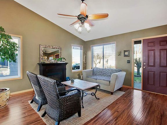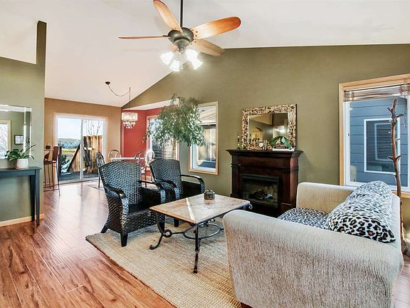 Welcome home! This impeccable 4-bedroom, 3 bath home is the one you have been waiting for. Updated beautifully throughout with rich wood laminate flooring, the living space is flooded with natural light from the large front picture window and windows flanking the cozy gas lit fireplace and vaulted ceilings. Adjacent is the kitchen and dining room combo, stunning with new granite countertops, backsplash and updated light fixtures including pendant lights and a chandelier. A door off the dining room leads to a large deck with a retractable awning to cover and shade while enjoying the spectacular lake views or hang out while watching the mounted outdoor TV in the hot tub that stays! Retreat to the master en-suite that includes a relaxing view of the lake from the windows, updated bathroom with new vessel sinks, gorgeous new tile backsplash behind sinks and along tub with separate shower, privacy window and new light fixtures with a large walk-in closet. An updated hall bathroom, large bedroom and a separate laundry room complete the main level. The fully finished basement with view out windows has a large family room with glass French doors leading to an office/bonus room, 2 large bedrooms and the homes third full bathroom. Beautiful back yard with sprinkler system and large trees back up to the lake and is fully fenced with multiple gates to access the walking path that leads to the neighborhood's swimming pool and recreation area that includes a playset and pickle ball courts. With Goddard school district, this house has it all and is ready for you to make it your home!