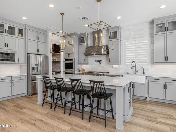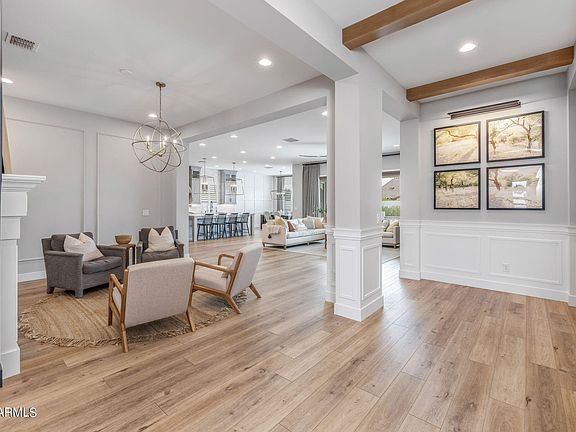 Stunning move-in ready single story with 4 BRs+2 flex rooms, 3.5 bathrooms on a premium corner lot with ample parking and a 30 second walk to the Club facilities. Fabulous open layout with a stunning kitchen featuring designer backsplash to the ceiling, double stacked soft-close cabinets with pull-out shelving, large island, quartz counters, gourmet GE Monogram appliances, beverage fridge & large walk-in/butler pantry. Inviting entryway with oak beams and timeless wainscoting. The added built in cabinets, custom closet, and tandem garage provide ample storage space. This N/S facing home has tons of natural light throughout! Backyard app-controlled heated pool and spa, 48'' fire pit, water features, marble pavers, turf yard, and citrus trees. Ready to be your home for the holidays!