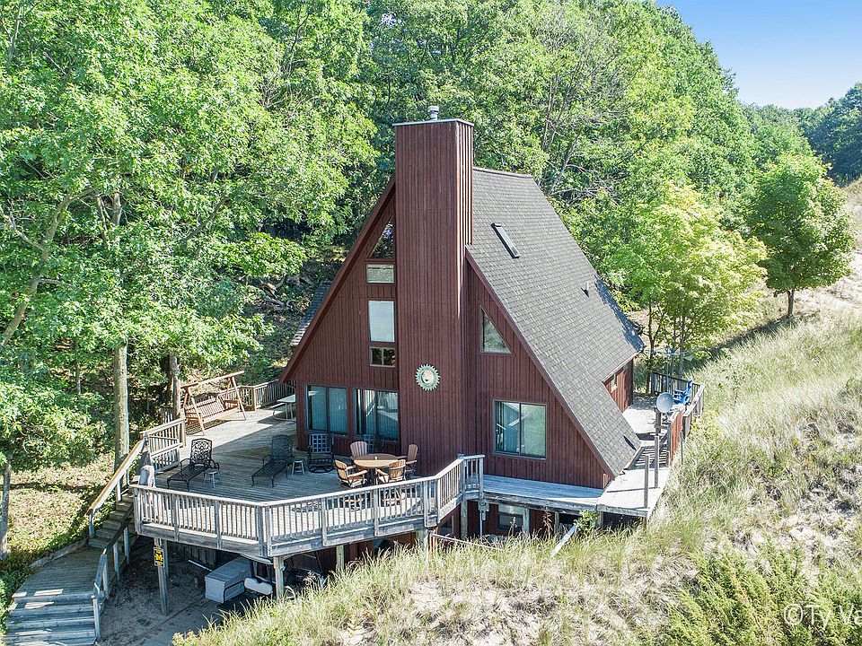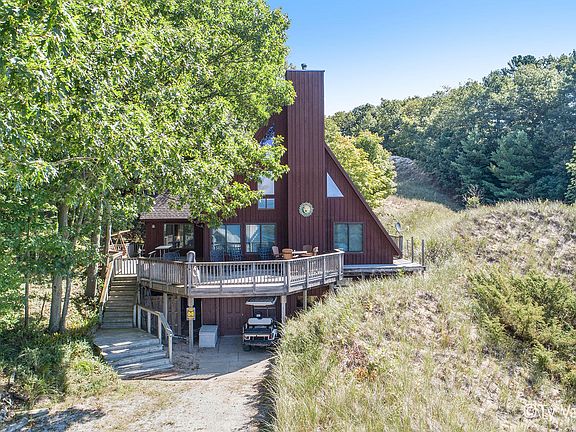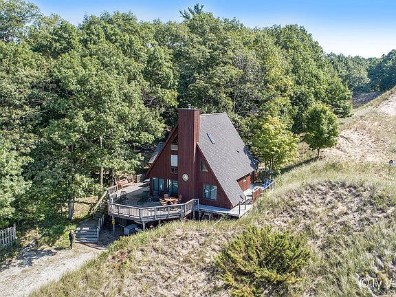 This 5 bedroom and 3 full bath cottage (or year round home) really does have it all! Situated on the dune side of Lost Valley, and very close to the association beaches...the views are simply stunning! It has been tastefully updated with wood floors, remodeled kitchen and baths, and newer roof, furnace and tankless water heater. You will love the soaring ceilings, three season sleeping porch, expansive decks, and ample parking for your guests...not to mention the privacy and feel of this upscale cottage. A main floor master bedroom, office space, and three living areas make this an easy choice. Just 55 minutes from GR, it's the best value by the beach. Don't wait around for this one.