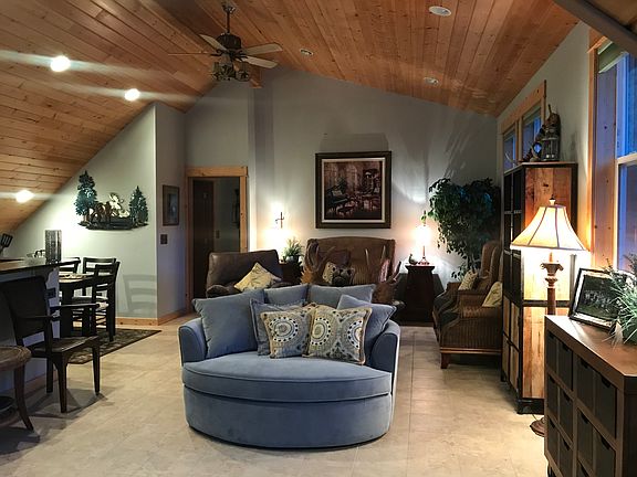 Stunning cabin on 1 acre w/stream-frontage & gorgeous interior. Open floor plan with beautiful kitchen that opens up to lg great room. Lg master suite with dual vanities, garden tub, lg shower, & its own private balcony. Decks off both front & back of home for expanded living... each with their own spectacular view. 2 car garage, RV hook-ups & under-balcony covered parking for your toys. Year-round access with maintained roads. Great hunting, fishing, snowmobiling, right out your back door!