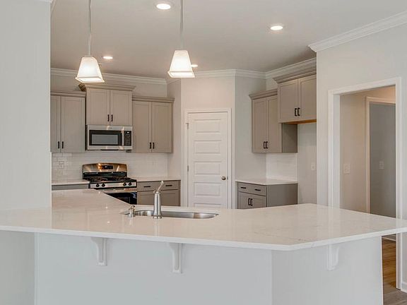 This two-story, Craftsman-style Henderson plan has three bedrooms and two and half baths. The foyer opens to a large great room. The thoughtfully designed kitchen features a large island with bar top seating and a large corner pantry. A coat closet, powder room and organizational space are all located near the garage entry.