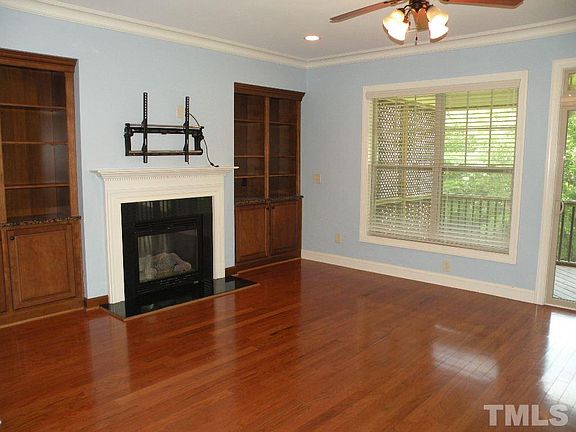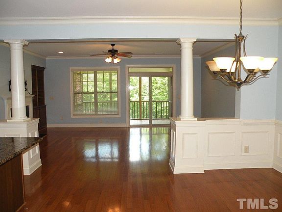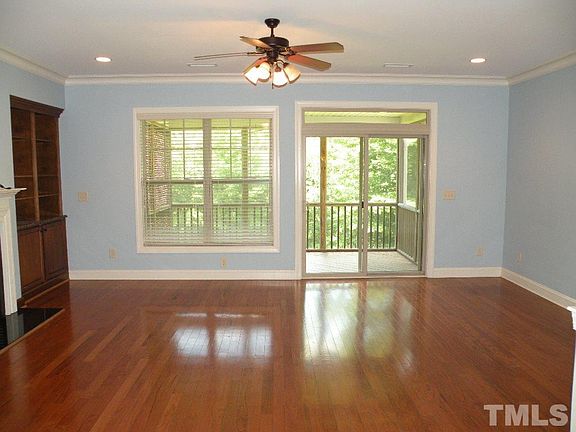 Nice townhome on a landscaped circle & backing to woods. 1-car garage. Open floor plan. Hardwoods all first floor. Kitchen w/ granite counter tops & center island. Spacious family room & dinning area. Master bath w/ garden tub and separate shower. Screened porch. Community pool, playground, picnic area and trails. Very convenient to RTP, I-540, shopping, restaurants & parks. Fridge, washer & dryer. Please verify schools. Note basement area is not included and not for rent.