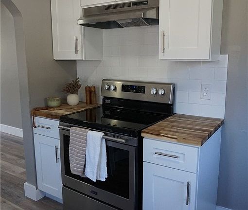 Take a look at this fantastic Cape Cod! Upon arrival you will be welcomed with a wrap around deck. The inside has been tastefully renovated and boasts new luxury vinyl tile and pleasing neutral colors. The living room provides ample space and recessed lighting. The kitchen features new cabinetry, butcherblock countertops, tile backsplash, and new range and stainless steel hood vent. The bathroom has been updated with a new vanity and bathtub/shower combo with tile surround. Enjoy access to the back deck from the dining room and first floor bedroom. The second floor master bedroom includes a walk in closet, built in storage, and skylights. Nice size yard with storage shed. Call today to schedule a private showing!