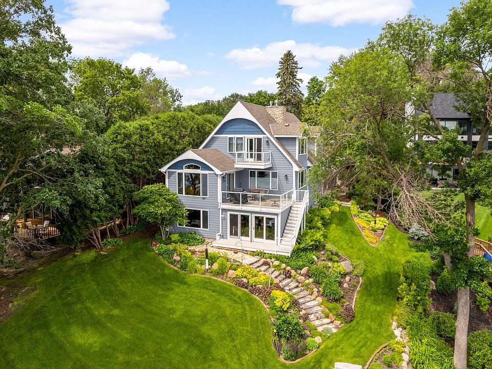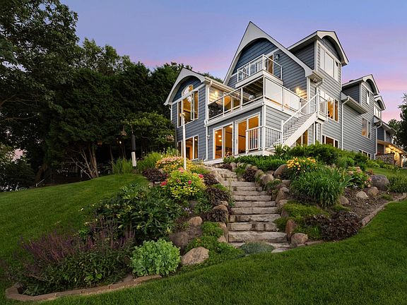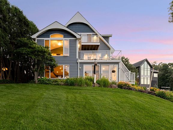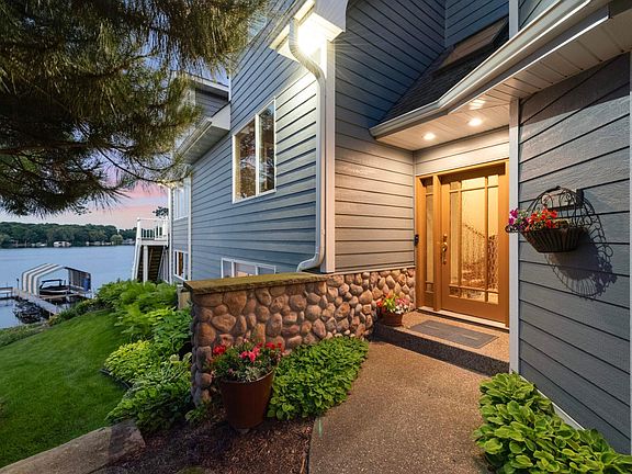 Welcome to this wonderful lakeside retreat with panoramic views of the water from almost every room! With ninety feet of lakeshore, this property sits on beautiful North Arm Bay. The home was extensively remodeled in 1999 by a previous owner. The current owner has carefully maintained, updated and improved virtually every inch of the home, including adding a gym, sauna space and steam shower as part of the spacious primary suite. From the primary you also enjoy stunning sunrise views over the lake. The beautiful landscaping and granite steps lead to the shore, where you will find new riprap and the new dock. The main floor is open and well-appointed. There are two bedrooms on the main floor. One has a built-in murphy bed. The other is currently used as an office with Desq office built-in workspaces. The main living area is open with a beautiful stone fireplace and stunning views of the lake. The lower-level walkout makes lake access easy too, from the spacious family room. There is also three car attached, heated garage, with coated flooring. Bring your boat and enjoy life at the lake!