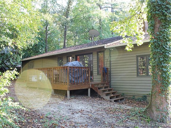 What a beautiful little gem in the gated golfing community of Carolina Trace. This 3 bedroom, 2 bathroom 1 car garage home sits on a quiet street peacefully nestled among the trees & only 1 mile from the front gate. With so many windows allowing natural light, the character in this home is charming. The open floor plan features a LARGE living room w/vaulted ceilings & gas fireplace. The kitchen boasts plenty of cabinet & granite counter space w/black appliances. Absolutely no carpet the laminate wood floors work well for any family. The master is very spacious w/an updated ensuite w/dual vanity, loads of storage & shower/tub combo. The 2 additional bedrooms are very generous in size w/great closet space. One of the bedrooms makes a great guest room or office as it has access to the laundry room & office nook. Relax on the large deck w/woodline views. This home is only a short walk to the lake where you can sit /relax and enjoy the views. HOA includes pool, tennis court & dock access.
