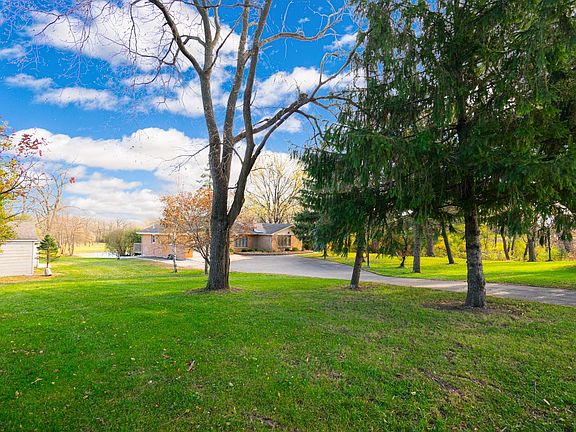"Expect the Unexpected" This all brick ranch sits on over 5 acres nestled amongst mature trees with private ponds and Fox River frontage*Your first eye catching view occurs as soon as you open the front door, as you see directly to the irresistible private back yard*Master 1 is split from the other 3 bedrooms with a private bath*Master 2 not only has a private bath but has direct access to the sunroom and perfect for extended family living*Bedroom 2, 3, and 4 all have hardwood floors*The living room features more hardwood flooring and a wood burning stone fireplace*The kitchen includes stainless appliance, pantry cabinet, tile backsplash, breakfast bar, and pull out selves in the cabinetry*Its breakfast room is exceptionally large to accommodate for all of life's special gatherings*The views from the family room draws you in and is accessorized with a vaulted wood ceiling accented with wood beams*The family room has direct access to the sunroom*The expansive combination laundry mud room has garage and deck access, an abundance of cabinet storage, and enough counters for folding and/or hobby space*The sunroom could become the perfect spot to relax and take in not only the breathtaking views, but the tranquility this property*The pond directly behind the house is stocked with fish*10 feet of the pond to the north is also included with this property*You need more than just pond fishing? Take your pole and walk the property to your private access to the Fox River* Bring your canoes and kayaks too. Don't worry about storage for all the toys, not only is there the 2 1/2 attached garage, but there is also a 2 1/2 detached garage and large shed for extra storage* Although this home is its own little oasis, everyday conveniences are right around the corner.
