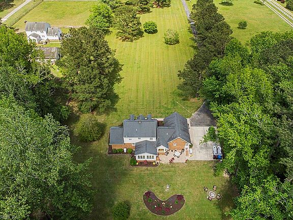 Meticulously maintained 5 bedroom and 3 bath brick home w/open concept living. Coveted first floor master w/ensuite bath and 3 secondary bedrooms up w/updated full bath! Laundry/mudroom with 3rd full bath by rear stairs to ROG/BR5. Flexible use of space with formal living w/french doors and dining rooms, or use as a library or home office. Fabulous family room w/built-ins and gas fireplace. Extensive hardwood flooring! Tucked in southern Chesapeake on private 5.15 acre wooded compound with room to roam and breathe! Oversize garage w/utility sink. Huge shed w/room for all the toys! Plantation Shutters! Whole house generator! All appliances convey. Move in ready!