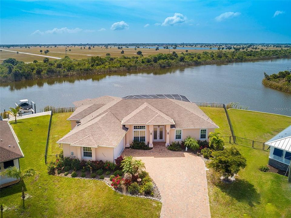 Simply Stunning. This Waterfront home is a boater’s dream and offers a Luxury Coastal Lifestyle you never dared to dream. Just past the upgraded brick paver driveway, beautiful tropical landscaping, and elegant covered front entry are gorgeous lead pane glass double front doors that provide your gateway to paradise. Located on an oversized tip lot, breathtaking Wide Water Views are showcased through numerous windows and pocketing sliding doors, just past your sparkling heated pool, screened brick paver lanai, and fenced yard. The attractive large tile on the diagonal leads you through this expansive retreat and the lighting and fan fixtures are pieces of art. The soaring tray and double tray ceilings add volume and are accented with lighting and custom crown molding. The water views distract even the most serious chef in the spacious kitchen that features granite counters, newer stainless appliances, a double oven, a glass cooktop in the island, and overlooks the family room, perfect for entertaining! This split floorplan offers privacy and 3 full bedrooms with their own bathrooms. Wake to expansive water views and have coffee on your lanai and plan your day. With no bridges to navigate, the boating opportunities are endless. Or float in your pool, listening to the happy fish splashing, and use the pool bath to keep the floors dry. If work is on the agenda, slip into the office to take that call. This home has hurricane windows and a security system for peace of mind. Live the Salt Life now! Please visit our 3D and Virtual Tours for a full walk though of this beautiful home!