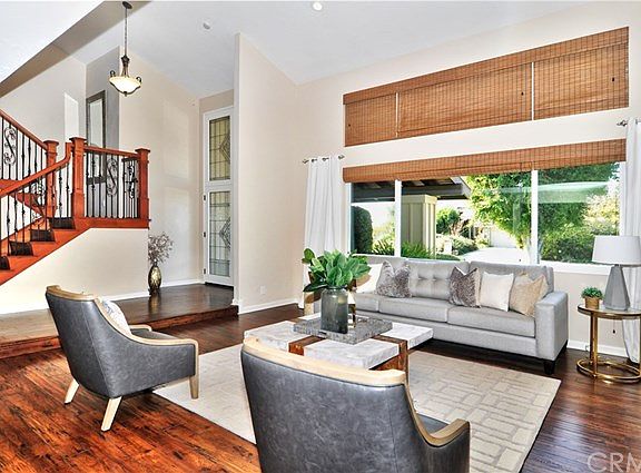 This remodeled home sits on a large flat lot in the heart of Villa Park*From the glass door glass entry to the soaring ceilings of the living room you will find only the finest in upgrades*The dark floors of the living & dining room extend into the family room & kitchen areas*open floorplan offers a modern kitchen w/center island, stainless appliances, gorgeous new designer backsplash, granite counters & rich dark cabinetry*adjacent family room also is accented by dark flooring, newly refaced fireplace, new custom built in cabinetry, ceiling fan, recessed lights & a wall of windows overlooking the grounds*The downstairs bedroom & full bath are perfect for guest quarters*Upstairs the master bedroom & bath is super spacious w/new soji style closet doors, vanity w/granite counters & designer glass sink*Three additional bedrooms are situated on the second floor for a total of 5 bedrooms*back yard offers complete privacy w/new patio cover, new landscaping/hardscaping & fabulous one of a kind custom trex fencing*amenities included newer paint, New water heater, Custom garage cabinets, Dry wall in attic w/pull down access to storage*Newly finished garage floor, Roof approximately 4 years old, custom closet organizers, New recessed lighting, upgraded Banister, New bathroom flooring, Newly landscaped back yard w/sunshine deck, Fruit trees including fig, pomegranate, lemon, lime, orange, avocado, Double pane windows (except for two French doors) This home is move in perfect!
