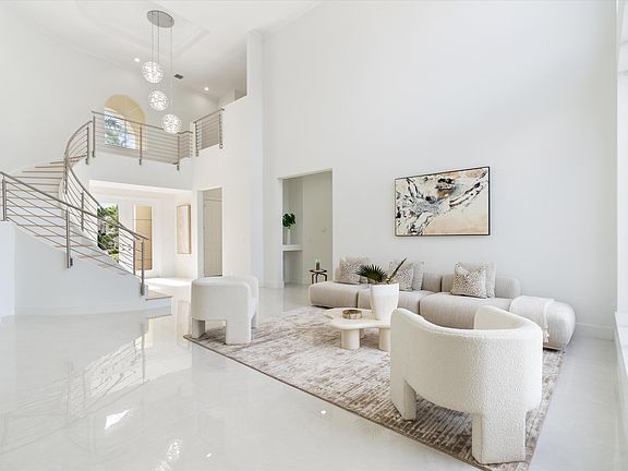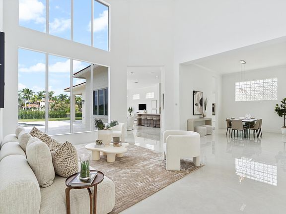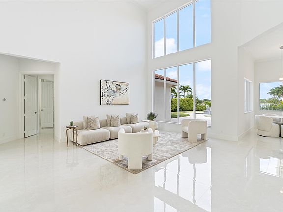 Exceptional and recently updated, this modern and luminous two-story residence boasts a captivating open floor plan with 4 bedrooms, 4.5 bathrooms, an office, and a spacious 2.5-car garage. Nestled within the sought-after Ibis Golf and Country Club, it affords one of the most expansive wide-water golf views available. The home exudes a contemporary aesthetic with clean lines and stylish design, featuring new porcelain and white oak floors, Taj Mahal Quartzite countertops, state-of-the-art appliances, LED recessed lighting, and upgraded systems such as new AC units and water heater. The property showcases magnificent water vistas, including a stunning view of Lake Ibis and distant perspectives of holes 12-15 on the Nicklaus-designed Tradition course. The 60x60 backyard has been transform into a newly renovated outdoor haven, a secluded retreat enveloped by lush landscaping. This outdoor oasis includes an inviting pool, spa, covered patio, creating a spectacular setting for both relaxation and entertainment. The expansive grass area adds to the charm, making it perfect for various outdoor activities. Situated on a pie-shaped lot in a cul-de-sac, the eastern side of the home features a private oversized yard, ensuring unparalleled privacy. The main level of the residence is thoughtfully designed, featuring a chic kitchen that opens to the family room and casual dining area, all adorned with floor-to-ceiling windows. The living room boasts soaring ceilings, and the primary suite, guest bedroom suite, office, and powder room complete the first floor. The second level provides a private haven for guests with two additional bedroom suites. Residents of this remarkable home can revel in the resort lifestyle offered by the Club at Ibis, with its beautifully landscaped grounds, recently renovated Sports Village and Clubhouse, three Nicklaus-designed golf courses, four unique dining experiences, and a plethora of activities for all interests. The club amenities include fitness facilities, tennis and pickleball courts, a spa, multiple pools, and various special interest clubs.