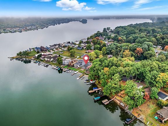 LAKE FRONT with a personal land DOCK! Experience turnkey lakeside luxury in this newer 3 bed, 2.5 bath retreat. The living room's soaring vaulted ceiling & sliding doors frame stunning lake views, opening to a concrete patio w/ electric awning & your private 6-year-old permitted land dock. Open-concept kitchen & dining area offers rich pine cabinets, a pantry w/ pull-outs & farmhouse sink. The main floor hosts newly carpeted serene primary suite w/ double sink, soaking tub & step-in shower. 2nd bedroom, full guest bath & laundry complete the level. Upstairs, a versatile loft-style bonus room, half bath & 3rd bedroom with a charming pine ceiling await. Enjoy easy maintenance with this young home. Amenities abound w/ extra deep 2-car detached garage- well suited for truck/boat with loft storage. Just 25 ft from the glistening waters of Conneaut Lake a rare 1st floor living option w/ just 2 steps to enter make it easily accessible. Home is approx 8 years young offering low maintenance!