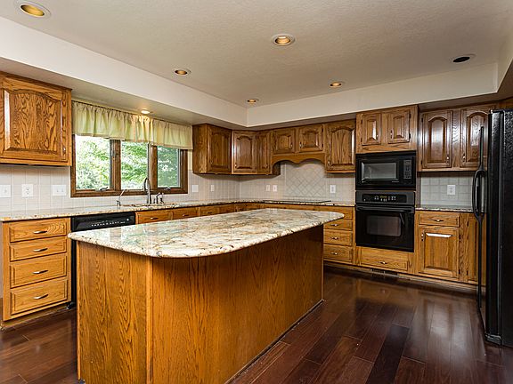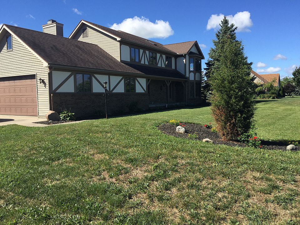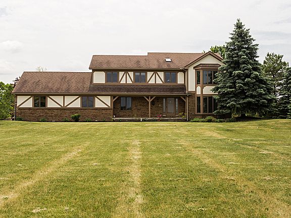 Fantastic home on 5 acres, + a pole barn & pond with a private beach. Huge kitchen w/ granite tops & large island. Master bed with vaulted ceiling, bay window, 2 walk-in closets and large jetted tub with skylights. New carpet, vaulted ceiling & fireplace in family room. Den with paneling and crown molding. Bright sunroom leads out to large deck. Geothermal heat installed in 2008. A must see!