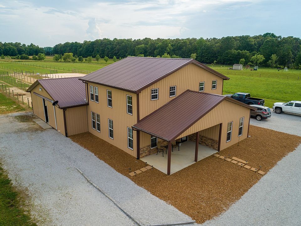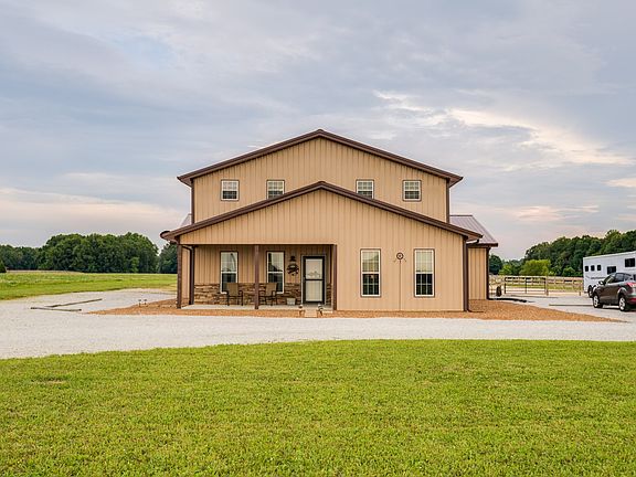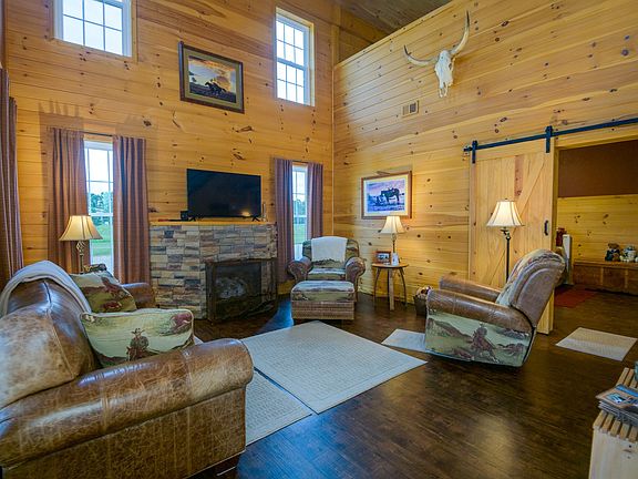 Gorgeous barndominium and horse farm! Home has a cabin feel with beautiful wood features and Vinyl Plank flooring throughout. Soaring ceilings and a rock fireplace in the living room. This farm boasts four over-sized horse stalls, each opening to a 200 ft run. Two paddocks, 57x175 riding ring, and tack room. John Deere tractor will stay. Truly a horse lovers dream!