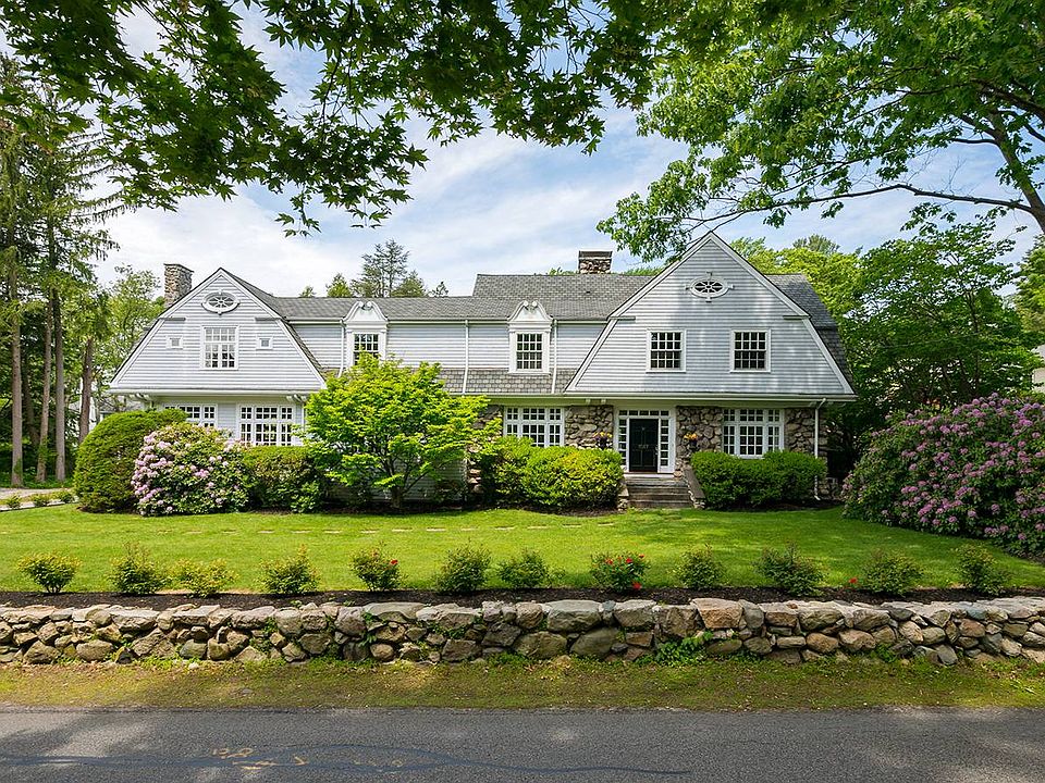 Welcome Home to 1057 Brush Hill Rd, a stately, coveted shingle style home in Milton's premier estate area. Accessorized with all you expect, the renovated kitchen has a large island capped by twinkling lanterns, dual Sub-Zero refrigerator and freezer, custom cabinetry, 6-burner cooktop, marble backsplash, dining area and endless views of the rolling lawn and bountiful gardens. Discreet home office is bathed in light and greenery; working from home just got better. Master suite has cathedral ceiling, walk-in closet and renovated bath. Interesting window detail throughout makes it unique. Three additional bedrooms with two more baths and a laundry room round out the second floor. Still more room to spread out in the lower level for spirited games of ping pong or foosball. Jump right into the heated saltwater pool on a private acre lot offering the best option for lazy summer afternoons. 1057 Brush Hill Road has all The Right Stuff.