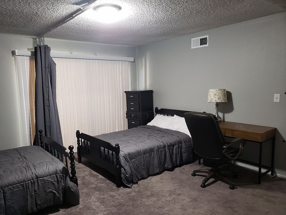 we have a fully furnished master bedroom complete with its own private bathroom microwave mini fridge and coffee maker. included is a shared large kitchen complete with all the cooking utensils to create your perfect meal. a large living room that you can stretch out and unwind after a long day of work. or work out with the many gym equipment available in the 2nd living room. the master bedroom is large enough that we can configure it as a studio witha couch and recliner or 2 beds with dividing curtains. feel free to contact us with your needs and we'll do our best to make your stay like home. all utilities and high-speed internet included lease duration flexible